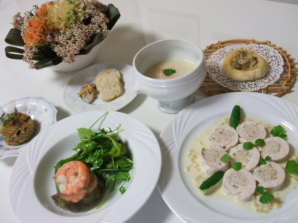 今回のテーマは”初夏のフレンチ・イタリアン”です。 前菜はゼリーで魚介類をかためたり、チーズケーキをデザートに清涼感をだしてみました。 今回のメインは、コルドンブルーで実際に作った料理をアレンジしてみました。 前菜 蟹入り、ホワイトアスパラガスのクリームスープ 海老とアスパラガスと茄子のゼリー オーガニックベビーリーフサラダ添え 玄米ときのこのリゾット メイン 鶏肉の詰め物 ハーブときゅうり添え デザート カッテージチーズケーキ マカロンアレンジ パン アンチョビーとマッシュルームのピザ 天然酵母全粒粉のミニバゲット (2007.5.6) |