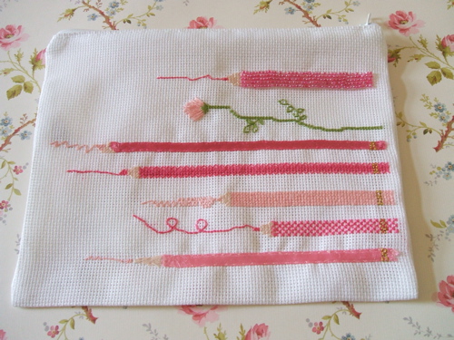 色合いはバラ色になっています。青木さんもバラ色ってどんな色 とおっしゃるほど沢山の色合いが出来そうです。 また、こちら一番上の鉛筆は、ししゅうではなく全て ビーズをぬいつけてあります。