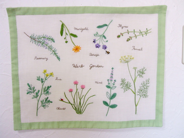 刺繍しています。ローズマリー、ルー(ヘンルーダ)、チャイブス、 ミント、ボリジ、マリーゴールド、タイム、フェンネル
