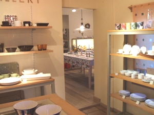 北欧のお洒落なグラスや陶器、キッチンツールが並んでいます。